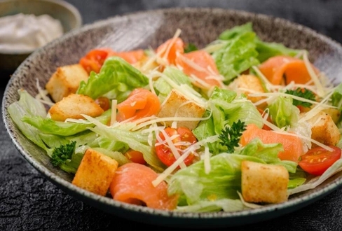 Cемга малосольная, салат Айсберг, помидоры черри, сыр Пармезан, хрустящие сухарики, соус Цезарь