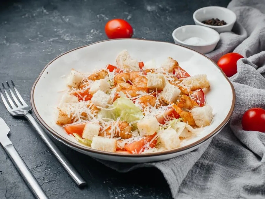 Креветки обжаренные, салат Айсберг, помидоры черри, сыр Пармезан, хрустящие сухарики, соус Цезарь